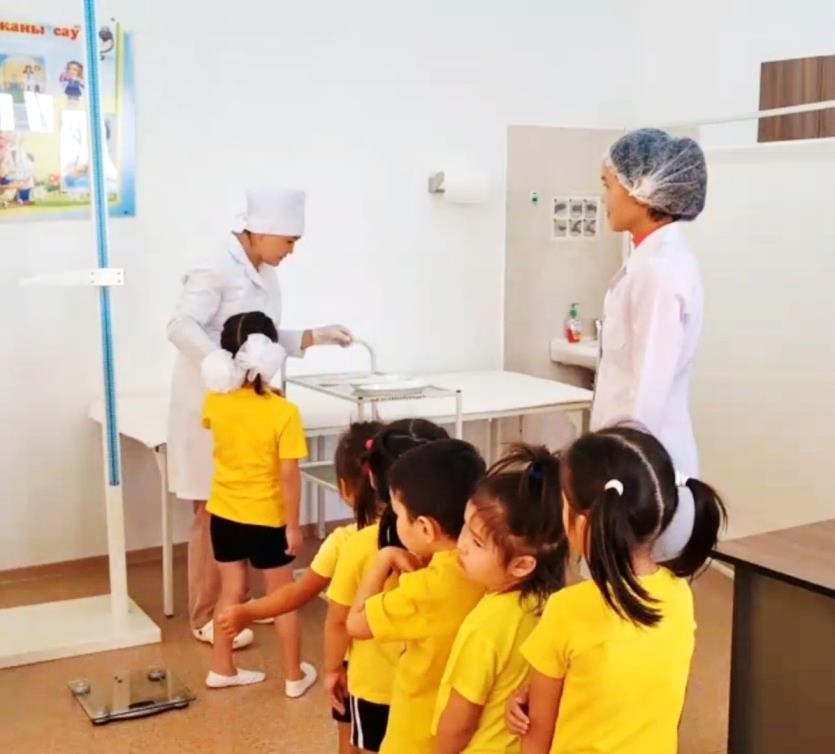 «Гаухар» бөбекжайында балалардың денсаулығына ықпал ететін іс-шаралар, таңертеңгілік жаттығулар күнделікті балабақша өмірінде. Сонымен қатар бөбекжай медбикесі балаларды күнделікті тазалығын тексеріп, салмағын, бойын өлшеп отырады.